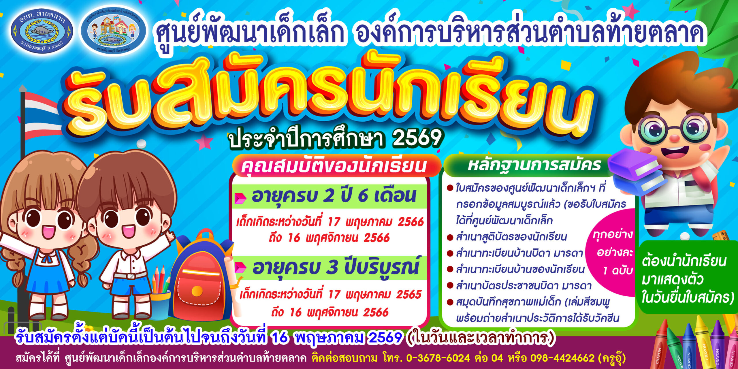 รับสมัครนักเรียนเพื่อเข้าเรียนในศูนย์พัฒนาเด็กเล็กองค์การบริหารส่วนตำบลท้ายตลาด ประจำปีการศึกษา 2569