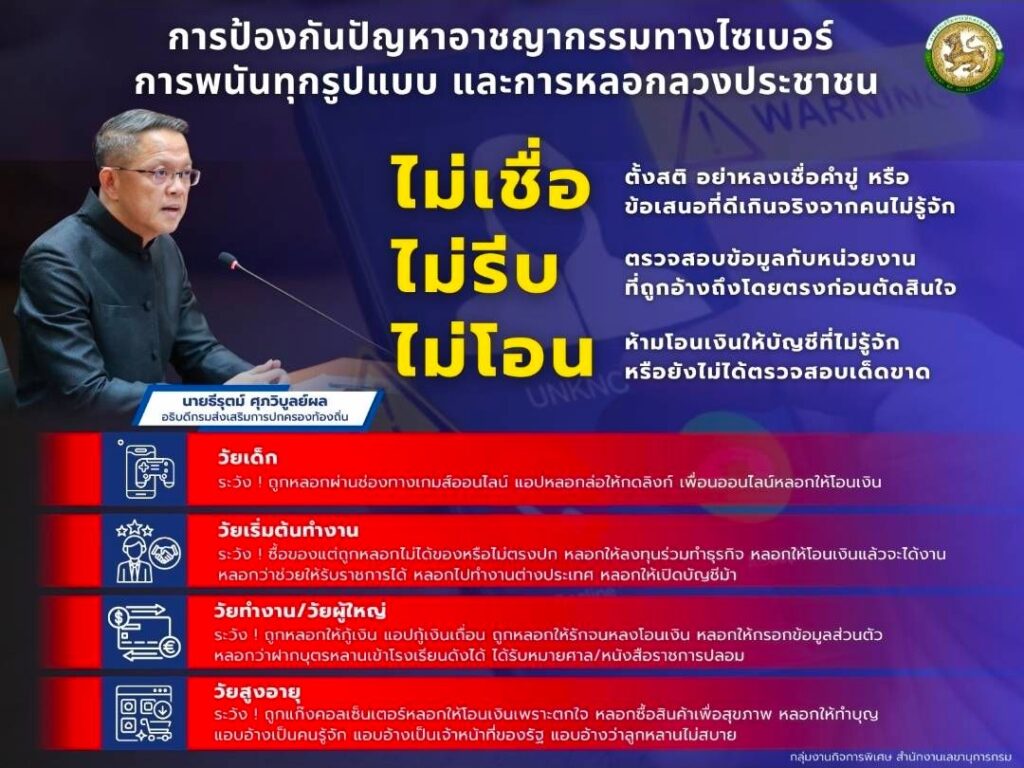 - วัยสูงอายุ ระวังการแอบอ้างเป็นญาติ คนรู้จัก หรือเจ้าหน้าที่รัฐ หลอกให้โอนเงิน หลอกซื้อสินค้าเพื่อสุขภาพ หรือการโกงคอลเซ็นเตอร์